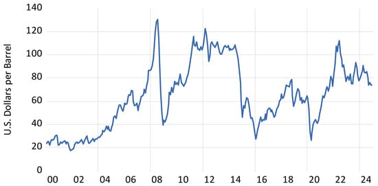 Figure 3 shows that oil prices are volatile. Fernald and Trehan [] noted that, unlike for domestically produced oil, an increase in prices for imported oil shifts income from domestic users to foreign oil producers. They thus argued that price increases for imported oil act like a tax on domestic users. Golub [] similarly observed that oil price increases transfer wealth from oil-importing countries such as Japan and Korea to oil exporters. High oil prices can thus harm firms in these countries.