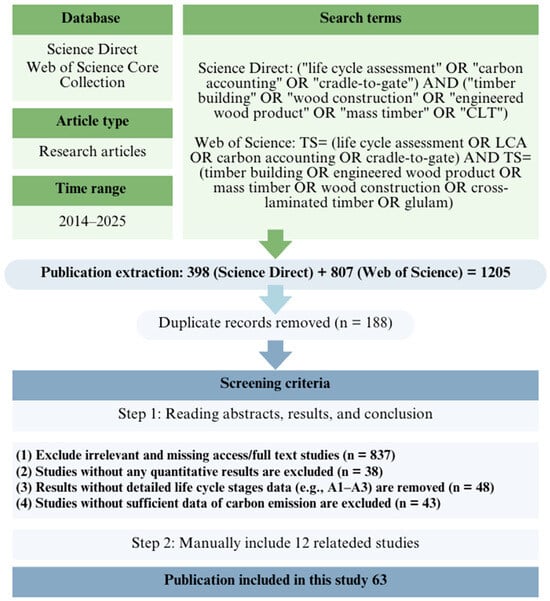 This study employs a systematic review method to identify and analyse carbon accounting studies on timber buildings and EWPs, with a focus on the production stage []. This review was conducted in accordance with the PRISMA 2020 guidelines []. Peer-reviewed journal articles published between 2014 and 2025 were retrieved from ScienceDirect and Web of Science Core Collection. The keyword strategy was designed to capture studies focused on carbon accounting methods and their application to timber products. It combined terms such as “life cycle assessment”, “carbon footprint”, “cradle-to-gate”, “engineered wood products”, and “timber buildings” to ensure comprehensive coverage of relevant literature. As shown in Figure 3, an initial pool of 1205 records was identified, with 188 duplicates removed. The remaining studies were screened in two steps based on title, abstract, and a full-text review, using predefined exclusion criteria (e.g., lack of quantitative carbon, failed to specify life cycle stages relevant to the production stage). In total, 51 studies met the inclusion criteria. Additionally, 12 EPD reports were manually included, as they provided valuable and comparable insights not captured through the initial search terms. In total, 63 studies were included for analysis, with a summary of the reviewed study characteristics and methodological details provided in Supplementary Materials I Tables S2–S6, and the completed PRISMA 2020 Checklist is available as Supplementary Materials II. All 63 included studies are cited here to ensure proper attribution and are listed in Supplementary Tables S2–S6 [,,,,,,,,,,,,,,,,,,,,,,,,,,,,,,,,,,,,,,,,,,,,,,,,,,,,,,,,,,,,,].