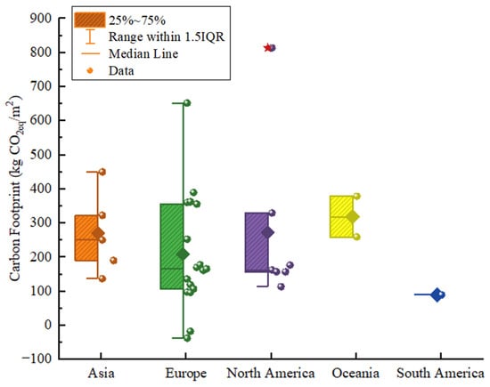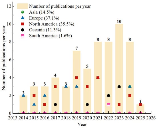 A total of 63 journal articles and reports on the carbon footprint (CF) of timber buildings and engineered wood products (EWPs) were reviewed, covering the period from 2014 to 2025 (Figure 3). Figure 4 presents a bibliometric overview of these studies, illustrating the annual publication trends and regional distribution. The number of publications increased steadily over time, with a notable peak between 2021 and 2024, reflecting the growing attention to decarbonising the building sector. Europe contributed the highest share of publications, followed by North America and Asia, highlighting the concentration of timber and LCA research in these regions. Although Oceania and South America contributed fewer studies, their recent upward trend indicates a rising interest in timber-based sustainability research across emerging markets.
