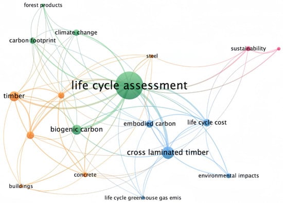 The keyword analysis across 51 journal articles identified 164 unique terms, with 14.6% occurring more than once. After grouping similar terms, such as “life cycle assessment” and “life cycle analysis,” the most frequent keyword was “life cycle assessment,” appearing 24 times, followed by “cross-laminated timber” and biogenic carbon”. The co-occurrence network map (Figure 5) reveals significant clusters, with “life cycle assessment” at the centre, highlighting its pivotal role in timber building and EWP research. Key associated terms include “embodied carbon,” “environmental impacts,” and “construction,” reflecting a focus on sustainability and CF reduction over the past decade.