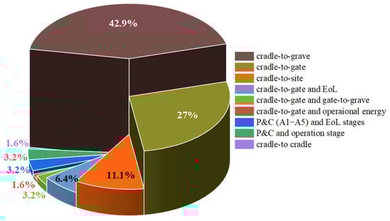 System boundary selection influences LCA outcomes significantly []. Figure 6 illustrates the dominance of cradle-to-grave system boundaries, representing 42.9% of the reviewed studies. For timber buildings, 56% of the 34 studies used cradle-to-grave, with B6 (operational energy) considered in 60% of cases. Interestingly, the EoL stages (C1–C4) and post-EoL stage (D) were more often assessed than the building use stage (B1–B7). In contrast, 53% of EWP studies applied cradle-to-gate, followed by 24% using cradle-to-grave (details shown in Tables S3 and S5). Notably, inconsistencies were observed in boundary definitions. For example, cradle-to-site (A1–A5) overlaps with production and construction (P&C) in some studies (e.g., [,]). Additionally, Moncaster et al. conduct a cradle-to-site and EoL study for a wooden building in Cambridge, UK []. Allan and Phillips assessed similar stages but used cradle-to-grave to define the system boundary []. These variations highlight the need for greater methodological standardisation in LCA boundary definitions.