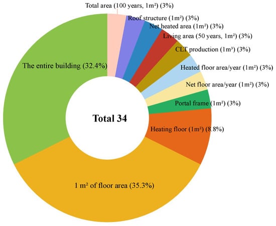 The functional unit varied across timber building studies, as illustrated in Figure 7 and Table S2, 1 m2 of floor area being the most used (35.3%), followed by the entire building (32.4%) and heated floor area (8.8%). Other functional units, such as net floor area per annum and 1 m2 of portal frame, accounted for smaller proportions but demonstrated the diversity in reporting practices. In contrast, nearly all LCA studies on EWPs adopted 1 m3 of product to use as the functional unit in most cases. For wood flooring studies, 1 m2 was often adopted to align with usage-specific impacts.