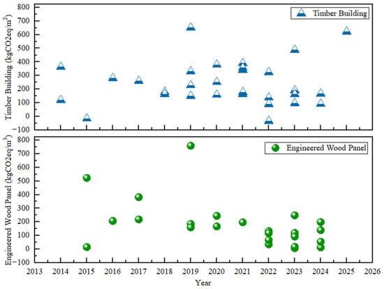 Engineered wood products (EWPs) and timber buildings are increasingly recognised for their potential to reduce greenhouse gas emissions by storing biogenic carbon and replacing emission-intensive materials. This article systematically evaluates the carbon footprint (CF) of EWPs and timber buildings during the production stage (A1–A3), identifies key sources of variability, and extracts quantitative emission reduction metrics. Based on a review of 63 peer-reviewed studies, CF values vary widely, from −40 to 1050 kg CO2eq m−2 for buildings and 12 to 759 kg CO2eq m−3 for EWPs, due to inconsistent system boundaries, functional units, and emission factor assumptions. Median CFs were 165.5 kg CO2eq m−2 and 169.3 kg CO2eq m−3, respectively. Raw material extraction (50.7%), manufacturing (37.1%), and transport (12.2%) were the dominant contributors. A mitigation matrix was developed, showing potential reductions: 20% via transport optimisation, 24–28% through low-density timber, 76% from renewable energy, 11% via sawmill efficiency, 75% through air drying, and up to 92% with reclaimed timber. The geographic skew toward Europe and North America underscores the need for region-specific data. The findings provide actionable benchmarks and strategies to support carbon accounting, emissions modelling, and climate policy for more sustainable construction.