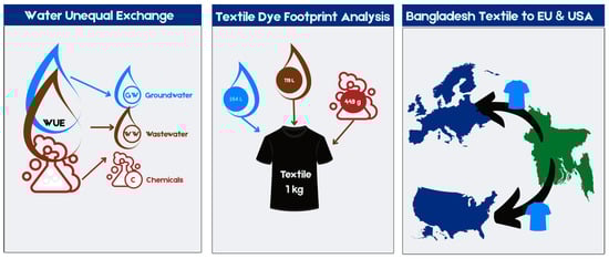The global production, consumption, and disposal of textiles have a significant impact on local water resources, environmental sustainability, human health, and broader society due to their heavy reliance on clean water and the use of toxic chemicals. The textile industry is responsible for 20% of global wastewater pollution, is the second-largest consumer of water worldwide, and uses over 15,000 different chemicals, some of which are toxic to human health and the environment [1,2]. Textile production has grown exponentially and is expected to keep rising in the coming years, leading to a 50% increase in water consumption by 2030 [2]. In addition, water insecurity and chemical pollution are interconnected and increasingly important aspects of the climate crisis. Over the past two decades, global chemical production almost doubled from 1.2 to 2.3 billion tons and is expected to triple by 2050 [3,4]. As a result, thousands of synthetic chemicals are released into the environment without the scientific ability to meaningfully assess the volume, composition, and toxicity that the Earth system can tolerate [4,5,6]. Although toxic chemicals and water use are prevalent across the entire global textile value chain (GTVC), from the production of raw materials through to the disposal of clothes, textile dye, also referred to as wet processing, uses the most water and toxic chemicals [2,7,8] and the impacts are unequally distributed across the globe. Most dye factories are located in China (44%) and Bangladesh (28%), placing a significant burden on local freshwater resources and causing chemical pollution [9,10]. While the EU and the USA are the most significant consumers and importers of clothes, the majority of the chemicals and water used in textile production occur outside the EU and the USA [2,11]. To reveal the unequal impacts of textile trade, this study applies the concept of ecological unequal exchange (EUE), which arises when high-income countries (HIC) shift the environmental burdens of consumption and production to low-income countries (LIC) and contribute to the overuse, pollution, and degradation of their natural resources [12]. Since EUE is yet to be applied to water, textiles, and Bangladesh, and acknowledging that water and chemical use form the main environmental burdens from textile dye production, this paper limits the scope of EUE to water and chemicals. This involved investigating the Water Unequal Exchange (WUE) by measuring wastewater, groundwater, and chemicals embedded in Bangladesh’s textile trade to the EU and USA between 2000 and 2023. Through these calculations, this paper reveals the hidden environmental cost of textile over-consumption and production and showcases how the international textile trade compromises sustainable development in the context of production.