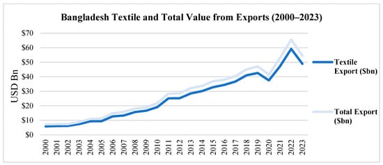Bangladesh is the second-largest exporter of textiles in the world, and its most significant export markets are the EU and the USA [14]. The value generated from Bangladesh’s textile exports has increased markedly and remains a significant proportion of the total export value over time. Figure 2 shows that the value generated from textile exports increased from USD 5.85 Bn in 2000 to USD 48.9 Bn in 2023, while the value generated from total exports increased from USD 7.25 Bn in 2000 to USD 54.5 Bn in 2023. This means that the textile sector’s share of total export value increased from an already high base, rising from 80.69% in 2000 to 89.72% in 2023 [18].