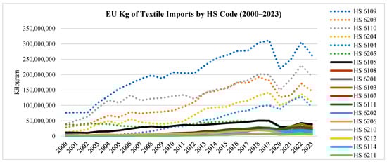 Taken together, this paper used OEC data for the selection of textile products based on value. As these data only show value and not the volume of goods, UN Comtrade data were used to determine the amount of kilograms traded. The data used from the UN Comtrade Database (2025) rely on the EU and the USA’s textile imports from Bangladesh in net weight by HS code between 2000 and 2023, as there are no time series data available from Bangladesh on textile exports [78]. These two regions, the EU (57%) and the USA (17.7%), were selected because they are Bangladesh’s most significant export markets [14]. In addition, as UN Comtrade data only show the weight in four-digit HS codes, the products were selected based on four-digit HS codes instead of a higher level of analysis, such as two-digit HS codes.