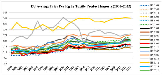 Although Figure 3 presents the average price per kilogram of all 18 textile products, the value generated and the price paid for each type of textile depend on various factors such as product complexity and quality demands, among others. In contrast, Figure 5 illustrates the price per kilogram of textile products imported into the EU, categorized by HS Codes from 2000 to 2023. The data reveal significant fluctuations in both the value and price per kilogram of textiles. The graph shows that knit t-shirts (HS6109) represent the majority of textile imports but are also the lowest-priced items compared to other products. For example, the price per kilogram of knit t-shirts increased from USD 7.16 in 2000 to USD 14.15 in 2023, yet it remains the lowest-valued product. In contrast, other women’s undergarments (HS6212) command the highest price per kilogram. This is attributed to the complexity of the products, the use of higher-quality materials, and the greater value added. In 2000, the EU paid USD 30.45 for one kilogram of HS6212, which rose to USD 40.20 by 2023. Additionally, the graphs indicate that prices per kilogram vary considerably, likely due to changes in demand, inflation, resource input costs, and labor costs. Notably, the price for coated fabric garments (HS6210) also experienced significant changes from 2000 to 2023, starting at USD 19 in 2000 and reaching USD 26.30 in 2023. Coated fabrics are waterproof and chemical-intensive, commonly used to make raincoats and backpacks. This product saw its weight increase dramatically, rising from 2,349,736 kg in 2000 to 11,455,848 kg in 2023.