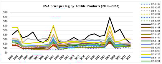 The price per kg of HS codes also varies between the EU and the USA. Figure 7 shows the average price per kg of textile products imported to the USA, disaggregated by HS codes from 2000 to 2023. This demonstrates that prices fluctuate significantly over time, and the spike in prices in 2008 and 2019 partly explains the significant drop in imports during the same years. Non-knit men’s suits (HS6203) account for the largest textile imports in terms of weight but receive a low price per kg compared to other textile products, decreasing from USD 18.9 per kg to USD 15.1 per kg. In addition, the graph shows that the price per kg of knit men’s shirts (HS6105) fluctuated significantly from 2000, where the average price was USD 40.8 per kg, to USD 21.5 per kg in 2023, with a temporary spike to USD 78.1 in 2019. Similar to the EU market, other women’s undergarments (HS6212) received one of the highest prices per kg, amounting to USD 56 in 2000 and USD 30.4 in 2023. Also, in line with the EU, HS6109 receives the lowest price per kg. This is USD 18.4 in 2000 and decreases to USD 10.3 in 2023. Despite higher prices paid per kg compared to the EU, USA prices have declined over time and have almost halved when excluding the 2008 and 2019 spikes in prices. By contrast, EU textile prices rose during the period considered [78].
