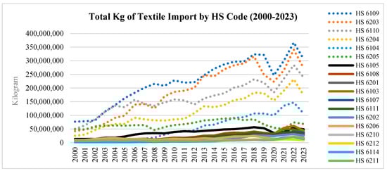 Figure 6 demonstrates the total weight of textile products imported to the USA from Bangladesh by HS code. Compared to the EU, non-knit men’s suits (6203) account for most of the textiles imported, as the graph illustrates a nearly tenfold increase from 13,696,246 kg in 2000 to 126,346,141 kg in 2023. Non-knit women’s suits (6204) are the second most imported textile product, increasing from 11,674,722 kg in 2000 to 63,120,941 kg in 2023. Lastly, knit t-shirts (HS6109) and knit sweaters (HS6110) represent the third most traded products in 2023, with HS6110 rising significantly after 2019. Figure 6 also shows a significant change in the volume of the various textile products imported throughout the last two decades, with sharp drops recorded in 2008 and 2019. In addition, the most significant amount of textile imports occurred in 2022, but this fell again in 2023. This indicates that the type and volume of textile imports fluctuate through time, and many factors influence these fluctuations, such as rising tariffs, inflation, price fluctuations of resource inputs, competition, and changing consumer demand, among others [78].