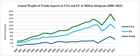 Annual Weight of Textiles imported to the USA and the EU (2000–2023).