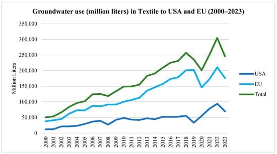 Compared to the value generated, the volume of textiles imported by the USA and the EU reflects hidden natural resource inputs and environmental impacts as a consequence of production. In particular, textile dye production is associated with the substantial use of water, chemicals, and wastewater, revealing WUE between Bangladesh and the EU and the USA. Figure 10 indicates the total amount of groundwater used during wet processing for the 18 textile products imported to the USA and EU between 2000 and 2023. For the USA, this amounted to 1,034,130 million liters, while 2,907,960.8 million liters of groundwater are used in the textiles imported to the EU. This shows that 3,942,090.8 million liters of groundwater were used to dye and process the EU and USA’s imported textile products during this period. Figure 10 also demonstrates that higher amounts of textiles exported are associated with more groundwater use. As a result, the volume of hidden clean water embedded in textile products consumed by the EU and USA represents an asymmetrical exchange where Bangladesh experiences an overextraction of groundwater resources while the EU and USA preserve their own water resources and externalize the environmental impacts of their textile consumption patterns. This WUE amplifies the water scarcity crisis in Dhaka, which has experienced an annual 3 m decline in its water table [25].