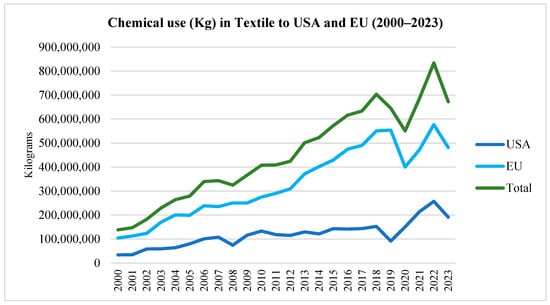 Chemical use (kg) in the USA and EU imports from Bangladesh (2000–2023).