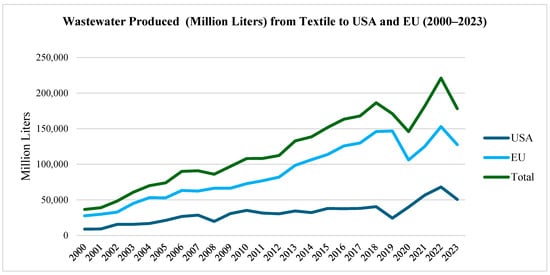 Wastewater Produced (Million Liters) from Textile to USA and EU (2000–2023).