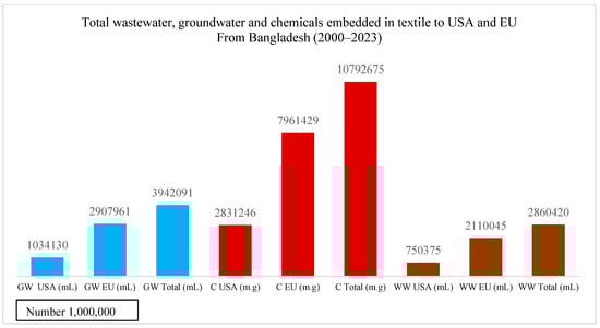 This paper investigated the presence of WUE by calculating the groundwater (GW), chemicals (C), and wastewater (WW) embedded in the textile trade from Bangladesh to the EU and USA. The calculations used existing trade data from UN Comtrade and footprint numbers from Uddin et al. (2023) [16,78]. The examination of WUE reveals the environmental inequality embedded in GTVCs by highlighting the overuse and pollution of local water resources within LIC to support growing textile demands in HICs. This paper finds that higher volumes of textiles are associated with more significant natural resource use and pollution. Figure 10 illustrates that GW embedded in USA textile imports was 1,034,130 million liters; for the EU, this was 2,907,961 million liters. This translates into an overall extraction of 3,942,091 million liters of groundwater to dye and process the textile exported to the EU and the USA between 2000 and 2023. Figure 11 shows that the total amount of C embedded in the 18 imported textile products to the EU and USA between 2000 and 2023 was 10,792,675 million grams. For the USA, this amounted to 2,831,246 million grams, and for the EU, 7,961,429 million grams. Lastly, Figure 12 indicates that 2,860,420 million liters of WW released between 2000 and 2023 stems from the dyeing of EU and USA textile imports. This is 750,375 million liters for the USA and 2,110,045 million for the EU. These figures underscore that GW, C, and WW embedded in textile production have increased significantly over the last two decades. As a result, this paper uncovered an asymmetry in water use and pollution between Bangladesh, the EU, and the USA. This validates the presence of WUE, as Bangladesh depletes and contaminates its own water resources to sustain the textile trade, reinforcing inequality along the GTVC.
