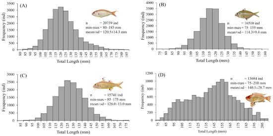 The length frequency distribution of four species of demersal fish—N. tambuloides (A), P. longimanus (B), U. sulphureus (C), and P. tayenus (D)—used in the Surimi industry in Paciran, Lamongan, East Java, Indonesia. All data and fish images are original and derived from this study (Supplementary Files S1–S5).