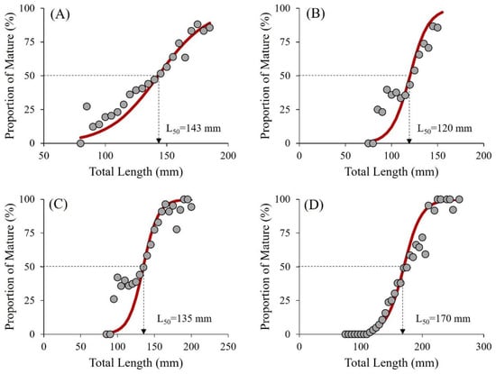 The length frequency distribution of four species of demersal fish—N. tambuloides (A), P. longimanus (B), U. sulphureus (C), and P. tayenus (D)—used in the Surimi industry in Paciran, Lamongan, East Java, Indonesia. Grey dots represent the observed proportion of mature fish, while the red lines represent the estimated proportion of mature fish based on the logistic equation. See Supplementary Files S1–S5.