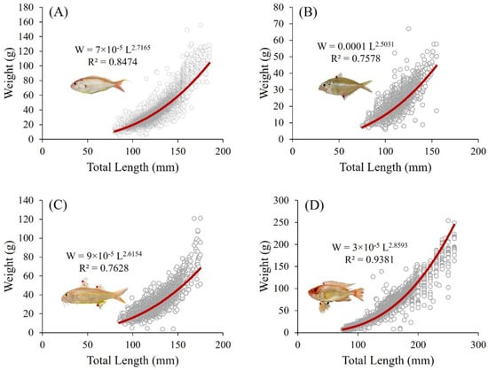 Length–weight relationships for four species of demersal fish—N. tambuloides (A), P. longimanus (B), U. sulphureus (C), and P. tayenustayenus (D)—used in the Surimi industry in Paciran, Lamongan, East Java, Indonesia. All data and fish images are original and derived from this study. See Supplementary Files S1–S5.