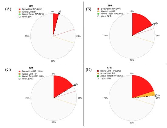 The spawning potential ratio was estimated for four species of demersal fish—N. tambuloides (A), P. longimanus (B), U. sulphureus (C), P. tayenus (D). The red line indicates a limit reference point of SPR20%, while the orange line represents a target reference point of SPR30%. See Supplementary Files S1–S5.
