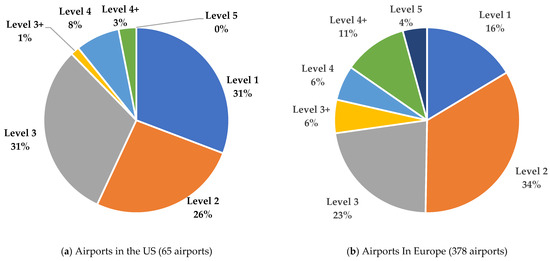 The number of airports that are participating in ACI’s ACA program is shown in Table 2, and the distribution of the participating airports in the US and Europe is shown in Figure 2. Globally, in North America and the US, the majority of airports (88%) are participating at Levels 1, 2, or 3. A participating airport may remain at the same level or may move up to a higher level depending on the local priorities and support. In the US, there are 65 airports in the ACA program; this is significant, but it represents only 17% of the 390 primary airports (as designated in NPIAS). The size of the airport does not necessarily correlate with participation in the ACA program or the level of participation. For example, considering the largest US airports in terms of enplaned passengers, Atlanta (ATL) participates at level 1, and Los Angeles (LAX) participates at level 4. DFW participates at level 4+, and O’Hare does not participate. There are no US airports at level 5. There are 20 airports globally at level 5, although they are not shown in Table 2; three of the level 5 airports are in India (e.g., Indira Gandhi International Airport, DEL), one is in New Zealand (Christchurch Airport, CHC), and the remaining sixteen are in Europe (e.g., Amsterdam Airport Schiphol in the Netherlands, AMS). Sweden and Finland have more level 5 airports than any other countries, with four each (e.g., Stockholm–Arlanda Airport, ARN, in Sweden and Rovaniemi Airport, RVN, in Finland) [29]. As illustrated in Figure 2, Europe has more airports participating in the ACI ACA program and also has a greater percentage of airports in levels 3+, 4, 4+, and 5 (12% in the US and 25% in Europe).