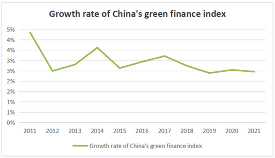 Empirical evidence underscores the policy’s success. As illustrated in Figure 1, China’s green finance index exhibited steady growth from 2010 to 2021, reflecting the sector’s maturation. Figure 2 reveals a declining yet stabilizing growth rate post 2017, signaling institutional consolidation. For instance, Lanzhou’s “Green Finance Hub” platform mobilized CNY 134 billion for ecological restoration in the Yellow River Basin, exemplifying localized policy impacts.