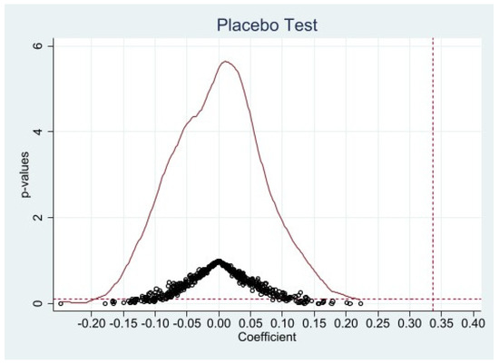 This paper conducts a placebo test by randomly generating dummy variables for pseudo-treatment groups and pseudo-policy shocks to examine whether unobserved city-specific factors might influence the adjustment of urban energy structures by the pilot policy [61]. Specifically, we use Stata 18 to randomly select 29 cities from the 259 sample cities as the treatment group and randomly assign policy shock timings, obtaining placebo coefficient estimates and p-values for the impact of the pilot policy on urban green innovation levels. This process is repeated 500 times. The kernel density of the 500 coefficient estimates and their p-value distributions are presented in Figure 5. The results show that the coefficient estimates generated through random treatment processes are mainly concentrated around zero, with most p-values exceeding 0.1. This provides evidence that the impact of the GFRIPZ policy on energy transition is not confounded by other random factors, thereby validating the robustness of our regression results.