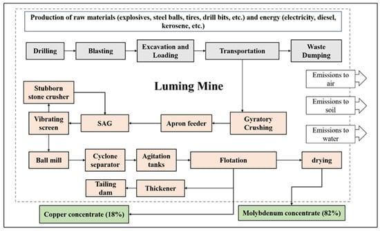 In this life cycle assessment, we designate the production of one tonne of molybdenum–copper concentrate as the functional unit, thereby creating a uniform basis for quantifying and comparing environmental impacts throughout all relevant stages. The cradle-to-gate boundary adopted here ensures that every activity up to the point at which the concentrate leaves the processing facility is captured while intentionally excluding downstream phases, such as product use and end-of-life disposal.