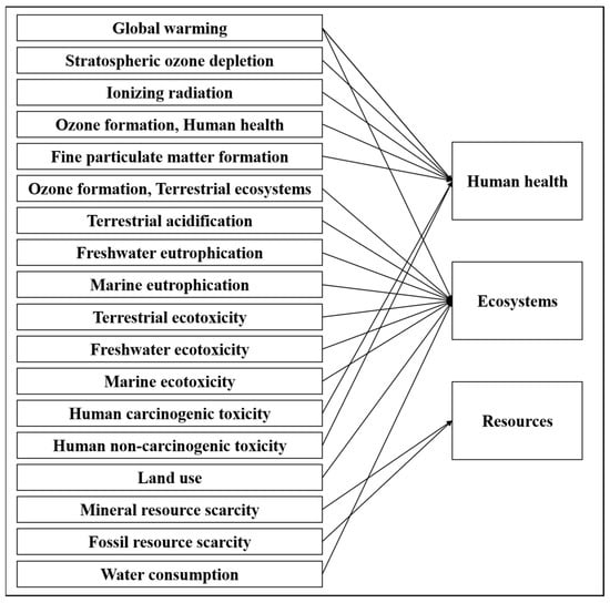 25]. ReCiPe 2016 is one of the most commonly used methods in life cycle assessment, which divides environmental impacts into 18 midpoint impact categories and 3 endpoint impact categories, as shown in