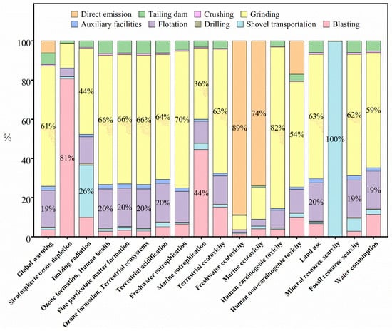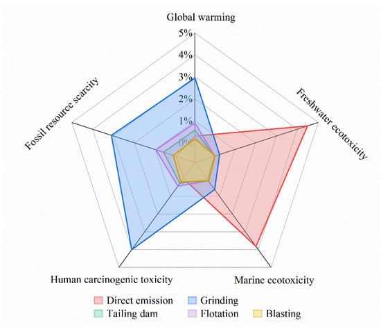 The research results show that the grinding stage is the primary source of environmental impacts in the open-pit molybdenum–copper concentrate mining and beneficiation process, particularly in categories such as human carcinogenic toxicity, global warming, and fossil resource scarcity, where its contribution is most significant. This phenomenon is primarily attributed to the high energy consumption of the grinding stage, with electricity usage accounting for more than 50% of the total energy consumption in the entire production process. Therefore, optimizing the grinding stage is a key direction for reducing the environmental burden.