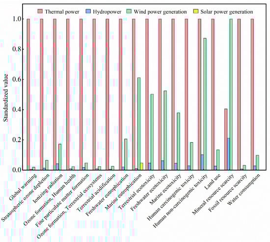 Figure 8 shows a comparison of the midpoint environmental impacts of thermal power generation and three types of low-carbon energy generation. Overall, thermal power generation exhibits much higher midpoint impact values across all environmental categories, far exceeding those of hydropower, wind power, and solar power. To quantify the specific improvements achieved by the three low-carbon energy scenarios in the categories of human health, ecosystem quality, and resource availability, we performed an endpoint LCA analysis. As shown in