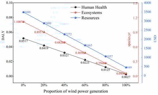 Figure 9. As wind-power proportion increases, endpoint impacts in the categories of human health, ecosystem quality, and resource depletion progressively decline. Under current circumstances, if Heilongjiang Province were to raise its wind-power share to 40%, the endpoint impacts of molybdenum–copper concentrate production would be reduced to 0.0321 DALY for human health, 0.6826 species.year for ecosystem quality, and USD 2273 for resource depletion.