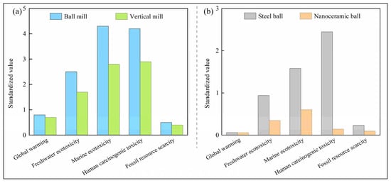 34]. Therefore, choosing the right grinding equipment and grinding media is crucial for controlling operational costs, reducing energy and material consumption, and minimizing environmental pollution in mining enterprises. In the production of molybdenum–copper concentrate, the commonly used grinding equipment includes ball mills and vertical mills. We conducted scenario analyses in which, while keeping all other production conditions constant, (a) the ball mill was replaced with a vertical mill, and (b) the steel grinding media were substituted with ceramic balls for comparison. A life cycle assessment method was used to compare the environmental impact of processing one tonne of molybdenum–copper ore with a ball mill and a vertical mill. The analysis results show that, for the overall environmental impact categories, the vertical mill reduces about 30% of the environmental impact compared to the ball mill. This is particularly evident in marine ecotoxicity, human carcinogenic toxicity, freshwater ecotoxicity, terrestrial ecotoxicity, and human non-carcinogenic toxicity, as shown in