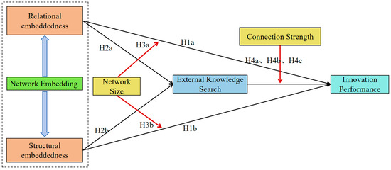 Among them, external knowledge search, as a crucial link in the open innovation process, has been widely used by scholars in collaborative network research. Previous studies have emphasized that when individuals are anchored in a network, internal embeddedness and network centrality affect information access and, thus, external knowledge search [18]. In addition, many studies have devoted attention to the relationship between external knowledge search and innovation performance, and there are four main research perspectives. First, external knowledge search is an essential skill for organizations to acquire, utilize, and federate knowledge, which, in conjunction with internal knowledge, forms the basis of innovation [19,20] and accelerates the innovation process. Second, the search for external knowledge is resource-intensive, which does not favor corporate innovation and sustainable development [21]. The cost and degree of external knowledge search will affect innovation performance differently at different phases, and the relationship between the two shows a positive U-shaped or inverted U-shaped curve [22,23]. Some studies have attributed this variability of results to industry characteristics, data sources, indicator selection, measurement methods, etc. Nevertheless, current research has overlooked the connecting effect of external knowledge search in the association of network embeddedness and innovation performance.