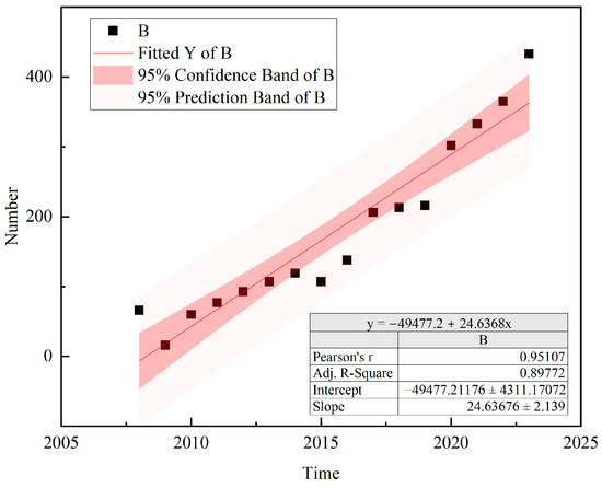 Joint patent applications are vital for major innovation subjects to reduce R&D costs and complement information resources. As shown in Figure 3, since 2008, the total amount of cooperative patent applications has generally risen, and the fitting function of the trend line is y = −49,477.2 + 24.6368x. In response to the detrimental effects of the banking crisis of 2008, the overall number of collaborative patent applications decreased in 2009. After 2009, the number of joint patent applications rose substantially, and in recent years, the upward trend has become increasingly evident. The upward trend is undeniable in recent years.