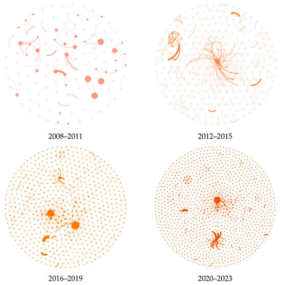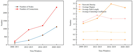 The structure and features of China’s NEV battery technology patent collaboration network are examined in this study using a number of statistical indicators, including the number of nodes, the number of edges, network density, average path length, and clustering coefficient. As illustrated in Figure 5, between 2008 and 2023, the innovation network exhibited substantial structural evolution, characterized by progressive diversification among core participants and a marked shift toward decentralized connectivity patterns. The “Double Credits” policy implemented in 2017 triggered significant network expansion, with node count and connection lines experiencing exponential growth, much like the regulatory effect Wang et al. (2024) found in their study on pollution abatement [62]. Concurrently, the systematic analysis revealed a paradoxical density decline, demonstrating an inverse relationship between innovative entity proliferation and network cohesion intensity. The average degree of the network grows from 1.744 to 2.037, and the connection between innovation subjects is slowly increasing, but the overall structure still tends to be loose. The average path length increases from 1.571 to 3.097, and the average distance between innovation subjects increases. The clustering coefficient declined in slow fluctuation, increased during 2012–2015 due to the emergence of individual cliques, and then continued to decline, indicating that the cohesion of the network became lower and the overall looser. From the perspective of the overall evolution of the network, the NEV battery technology cooperation network does not have the characteristics of a “small world”.