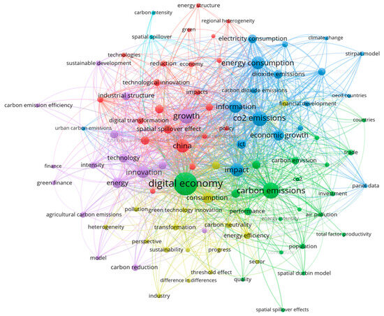 Research on the digital economy has gained popularity in academia in recent years. Numerous scholarly works concentrate on research subjects such as ‘digital economy’, ‘carbon dioxide emissions’, ’economic growth’, ‘energy consumption’, and ‘power consumption’, as illustrated in Figure 1. Research pertaining to the digital economy-driven decrease in urban carbon emissions can be broadly divided into three categories, according to a thorough analysis of the body of existing literature on the topic: research on the digital economy, research on the reduction of carbon emissions, and research on the influence of the digital economy on the reduction in question.