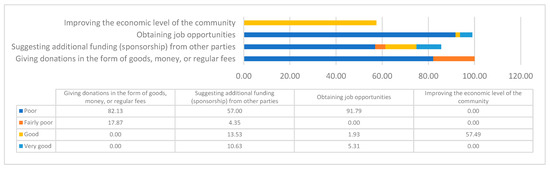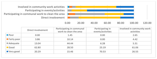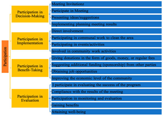 According to [55], community participation is community empowerment and participation in the planning and implementation of development programs/projects, and it is also the actualization of the will of the community to sacrifice and contribute to the implementation of development. Community empowerment, as a development management strategy, requires (a) direct involvement of the community in the entire development management process, (b) the government and all development management institutions to create the widest possible access for the community to play an active role in the development process, and (c) the democratization of development management at the community level [56].