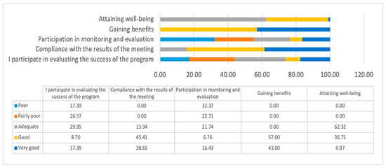 Furthermore, reference [66], in her theory Governing the Commons, argued that the success of managing common-pool resources greatly depends on the extent to which local communities are involved in rule-making and decision processes. High levels of participation enhance legitimacy, commitment, and compliance with collectively agreed outcomes. In the context of environmental programs, [67], in his systematic review of participation in environmental management, emphasized that meaningful and inclusive participation not only improves decision quality but also strengthens the social capacity required for long-term sustainability.
