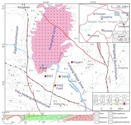 The regional geologic setting of study area. 1: Quaternary; 2: Paleogene; 3: Cretaceous; 4: Jurassic; 5: Tertiary; 6: Devonian—Permian; 7: Silurian; 8: Cambrian—Ordovician; 9: Nanhua—Ediacaran; 10: Granite; 11: Fault; 12: Supposed fault; 13: Tectonic boundary; 14: Parameter well; 15 Survey well.