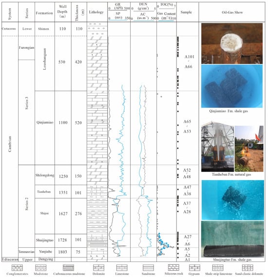 Well Yidi2 successively encountered several formations from top to bottom, including the Cretaceous Shimen Formation, the Cambrian Loushanguan Formation Tianheban Formation (THB Fm.), Shipai Formation (SP Fm.), Shuijingtuo Formation (SJT Fm.) and Yanjiahe Formation (YJH Fm.) (Figure 2). The well was drilled to a total depth of 1806 m, with the final drilling layer being the Cambrian Denying Formation. Among these, the LSG Fm. consists mainly of dolomite, the QJM Fm. is composed of dolomite interbedded with gypsum-salt layers and marlite, the SLD Fm. features dolomite with dissolved pores. The THB Fm. is a mud-banded limestone, while the SP Fm. is a set of clastics rock mainly made up of mudstone. The SJT Fm. develops limestones in the upper part and carbonaceous shale in the lower part, while the YJH Fm. is mainly composed of marlite with thin shale. Abundant natural gas has been discovered in the THB and QJM Fms. of Well Yidi2 [27]. Specifically, the total organic carbon (TOC) in the shale of SJT Fm. ranges from 0.52% to 5.96%, with an average of 2.26%, and the Ro value is 2.25%. The thickness of gas-bearing shale in this layer up to 72 m, with desorption gas content ranging from 0.19 to 3.65 m3/t. The shale gas is composed of over 95% methane and trace of ethane and nitrogen, reflecting typical characteristics of dry gas [28].