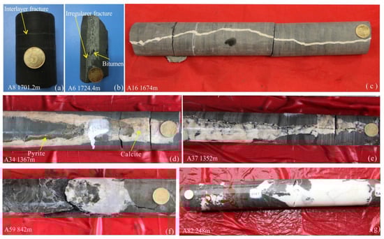 Typical photos showing characteristics of fractures of Well Yidi2. (a) horizontal fracture in SJT Fm., sample A8, 1701.2 m; (b) irregular fracture within calcite interlayer in SJT. Fm., sample A6, 1724.4 m; (c) vertical fracture in upper calcite section of SJT Fm., sample A16, 1674 m; (d) vertical fracture, calcite and pyrite veins at the top of SP. Fm., sample A34, 1367 m; (e) partially filled fractures in THB Fm., sample A37, 1352 m; (f) irregular fracture filled with gypsum in QJM Fm., sample A59, 842 m; (g) fractures filled with coarsely crystalline calcite in LSG Fm., sample A82, 248 m.
