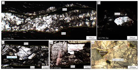 Photomicrograph showing the fracture fillings of Well Yidi2. (a) Horizontal fractures filled with calcite and euhedral quartz (b), SJT Fm., sample A8, 1701.2 m; (c) fracture filled with calcite, sample A8, 1701.2 m; (d) vein grows from the fracture wall toward the center in a partially filled fracture, sample A23, 1651.5 m; (e) the fractures are filled with coarse-grained calcite and fragmented limestone breccia. THB Fm., sample A38, 1347.7 m.