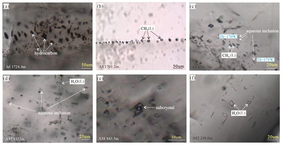Statistical analysis of thin sections indicates that brown hydrocarbon and gray methane inclusions dominate the vein from the YJH-SJT Fms. Two-phase (gas-liquid) inclusions are relatively scarce, especially in horizontal and irregular fractures, which are primarily filled with brown hydrocarbon and methane inclusions. Some methane inclusions exhibit distinct negative crystal morphologies (Figure 5a,b). In the SJT Fm., fluid inclusions display a clear spatial distribution trend from the vein walls toward the center of fracture fillings. Liquid hydrocarbon and high-density methane inclusions are concentrated along the vein walls, while a small number of gas-liquid two-phase inclusions and occasional aqueous inclusions appear at the fracture centers (Figure 5c). Inclusions in the lower SP Fm. and THB Fm. resemble those in the upper SJT Fm. but show an increased presence of two-phase and aqueous inclusions (Figure 5d). Samples from the QJM Fm. contain two-phase inclusions with subcrystal (Figure 5e). The LSG Fm. is characterized by abundant two-phase and aqueous inclusions (Figure 5f), along with a minor occurrence of gaseous inclusions and significant variations in the gas-liquid ratios of two-phase inclusions. Occasionally, two-phase inclusions with subcrystal are also observed. The petrographic characteristics of different inclusion types are detailed as follows.