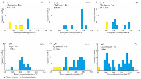 Histogram of homogenization temperatures for fluid inclusions in Well Yidi2. (a)sample A8, 1701.2 m, SJT Fm; (b)sample A12, 1681 m, SJT Fm; (c) sample A15, 1674.5 m, SJT Fm; (d) sample A37, 1352 m, SP Fm; (e) sample A58, 843.5 m, QJM Fm; (f) sample A82, 248.6 m, LSG Fm.