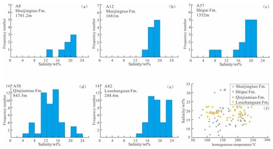 The salinity histograms and the correlation between homogenization temperatures and salinities for vein inclusions in Well Yidi2. (a) sample A8, 1701.2 m, SJT Fm; (b) sample A12, 1681 m, SJT Fm; (c) sample A15, 1674.5 m, SJT Fm; (d) sample A58, 843.5 m, QJM Fm; (e) sample A82, 248.6 m, LSG Fm; (f) the correlation between homogenization temperatures and salinities for vein inclusions in Well Yidi2.