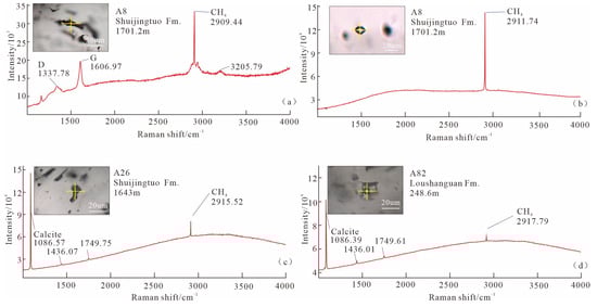 The Raman spectra of hydrocarbon inclusions from the SJT Fm. exhibit distinct “D” (1250–1450 cm−1) and “G” (1500–1605 cm−1) peaks, indicating a high degree of thermal evolution [40]. Some highly evolved hydrocarbon inclusions also contain distinct methane peaks (Figure 8a).