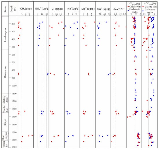 The hydrogeological cycle of basins often undergoes centrifugal flow during the sedimentary compaction stage and centripetal flow during the uplift and erosion stage [41,42], leading to the complexity of paleo-fluid origins. The origins can be classified into interlayered sedimentary water, meteoric water, or retained sedimentary water [42,43]. In this study, the stratigraphic profiles of fluid inclusions composition and veins isotopic was established from Well Yidi2 (Figure 9) to comparatively analyze the properties and origins of paleo-fluids.