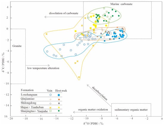 After grinding the samples to 200 mesh and heating them to remove adsorbed water, they were placed in a vacuum reactor and reacted with phosphoric acid at 25 °C for 24 h. The resulting CO2 gas was purified and collected, and the carbon and oxygen isotope compositions were determined using a Thermo Fisher MAT253 mass spectrometer (Thermo Fisher Scientific, Waltham, MA, USA). The results are reported as relative δ-values (V-PDB). During the analysis, standard samples GBW04417 and NBS19 were used for quality control, with an analytical error of ±0.2‰ [33].
