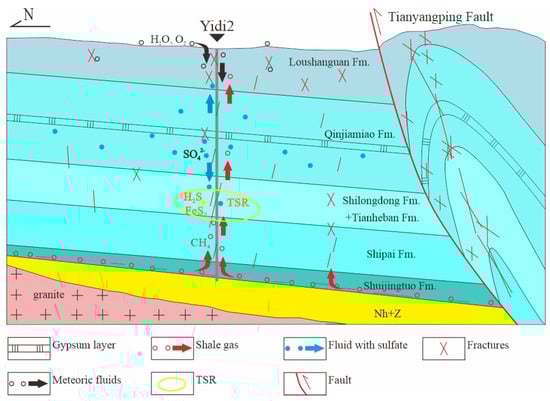 The δ13C values of calcite veins in the SP Fm. are lower than those of the corresponding limestones, while the δ34S values of fracture-filling pyrite veins are similar to those of gypsum-salt layer in the QJM Fm. but significantly higher than δ34S values of pyrite in Early Cambrian shale (<30‰) [51]. This suggests that sulfur in the SP Fm. pyrite originates from the QJM Fm. evaporite layers. As mentioned above, the SO42− content in vein inclusions decreases from the QJM Fm. downward to the SJT Fm., whereas CH4 content increase. It can be inferred that high-salinity fluids migrated downward from the QJM Fm. along fractures, while hydrocarbons migrated upward from the SJT Fm., triggering thermochemical sulfate reduction (TSR) in the SP Fm [52,53]:.