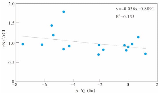 The Na-Cl coefficient of inclusion assemblages exhibits a certain correlation with Δ18O, the difference between 18O value of vein and that of limestones (Figure 12), indicating that reducing fluids with low water/rock ratio originate from a close system, whereas fluids with meteoric water mixing typically exist in high water/rock ratio, open environments. However, the correlation is not very pronounced, as isotopes primarily reflect the mineralization environment of veins, whereas ion compositions can also indicate the formation environment of secondary inclusions after the veins formation.