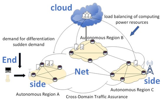 With the rapid advancement of mobile Internet and IoT technologies, traditional centralized cloud computing architectures have struggled to meet the low-latency demands for real-time services, often causing core network congestion and privacy vulnerabilities [1]. This challenge has catalyzed the emergence of cloud–edge collaborative computing architectures that synergize cloud-scale data processing with edge nodes’ localized responsiveness, thus forming a “cloud–edge–end” triad that optimizes resource utilization and service quality [2,3]. As illustrated in Figure 1, the Network Collaborative Open Control Architecture (NCOCA) epitomizes this paradigm through distributed autonomous decision-making and entity-level coordination, which contrasts sharply with legacy centralized systems prone to single-point failures and scalability constraints [4]. By decentralizing management functions to network entities, NCOCA enhances operational efficiency while enabling mission-critical applications such as millisecond-response power grid inspections and the distributed vehicular network processing of dynamic road conditions [5].